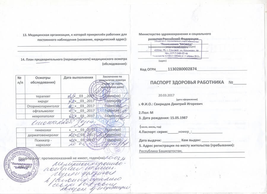 После этого вы вновь посещаете терапевта, который выдает заключение и подписывает бланк. Срок действия такой документации составляет два года, после чего ее требуется оформлять заново. Бланк выдается без диагноза, на нем указывается, что пациент здоров и может выполнять свои трудовые обязанности.