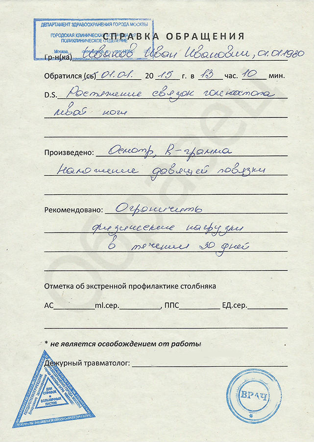 Клиенту не нужно ходить в больницу, эту обязанность берет на себя наш сотрудник – сразу же после получения заявки он связывается с клиникой и отправляется для оформления. Менеджер обговаривает с врачом диагноз, который указывается в бумаге, затем документ заверяется подписью и печатями учреждения.