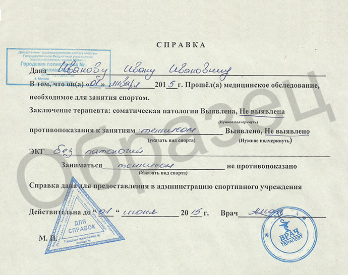Терапевтическое заключение – это разрешение на посещение спортивных занятий и рекомендации по типу нагрузок. В медсправке обязательно указывается вид спорта. Обратите внимание, некоторые фитнес-центры могут иметь дополнительные требования по прохождению медицинского обследования.